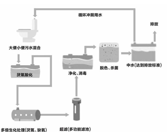 采用微生物技術(shù)和生化技術(shù),將大小便經(jīng)過厭氧、好氧等有機物反應,對有機物進行分解消耗,再通膜過濾,消毒達到水質(zhì)凈化并實現(xiàn)持續(xù)循環(huán)使用。
